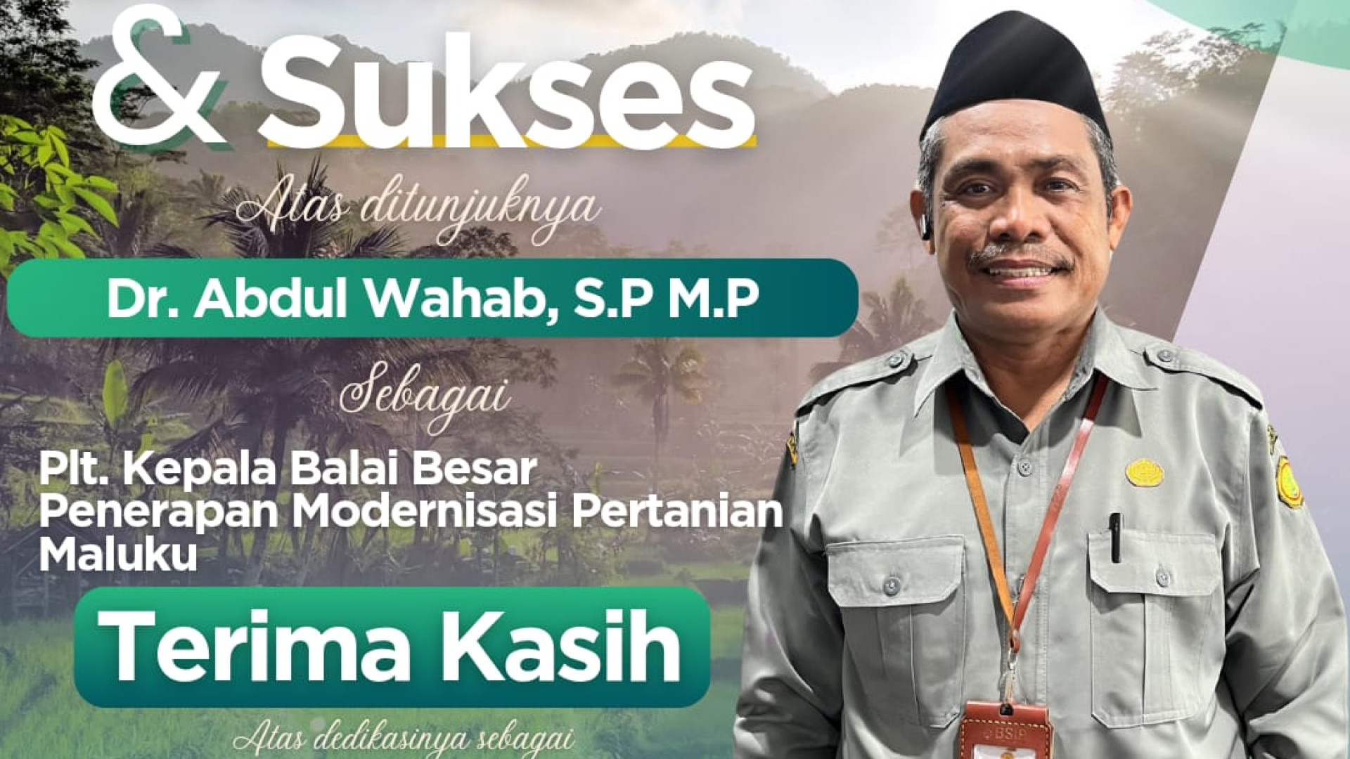 Dr. ABDUL WAHAB, SP., MP lahir di Bone pada tanggal 22 Januari 1970. Beliau memperoleh gelar Sarjana Strata 1 (S1)TAHUN 1996 pada Universitas Hasanuddin Jurusan Agronomi Fakultas Pertanian dengan gelar SP. Kemudian melanjutkan pendidikan S2 tahun 2011 pada universitas Haluoleo Jurusan Agronomi dengan gelar MP. Selanjutnya berhasil menyelesaikan Program Doktoral (S3) tahun 2016 di Universitas Haluoleo Jurusan Agronomi. Yang bersangkutan pernah melaksanakan tugas sebagai kepala Seksi Kerjasama dan Pelayanan Pengkajian BPTP Sulawesi Tenggara pada tahun 2017, Pernah menjabat sebagai kepala BPTP Sulawesi Tengah pada tahun 2023 hingga 2025 dan sekarang menjabat sebagai kepala Balai Penerapan Modernisasi Pertanian Nusa Tenggara Timur.